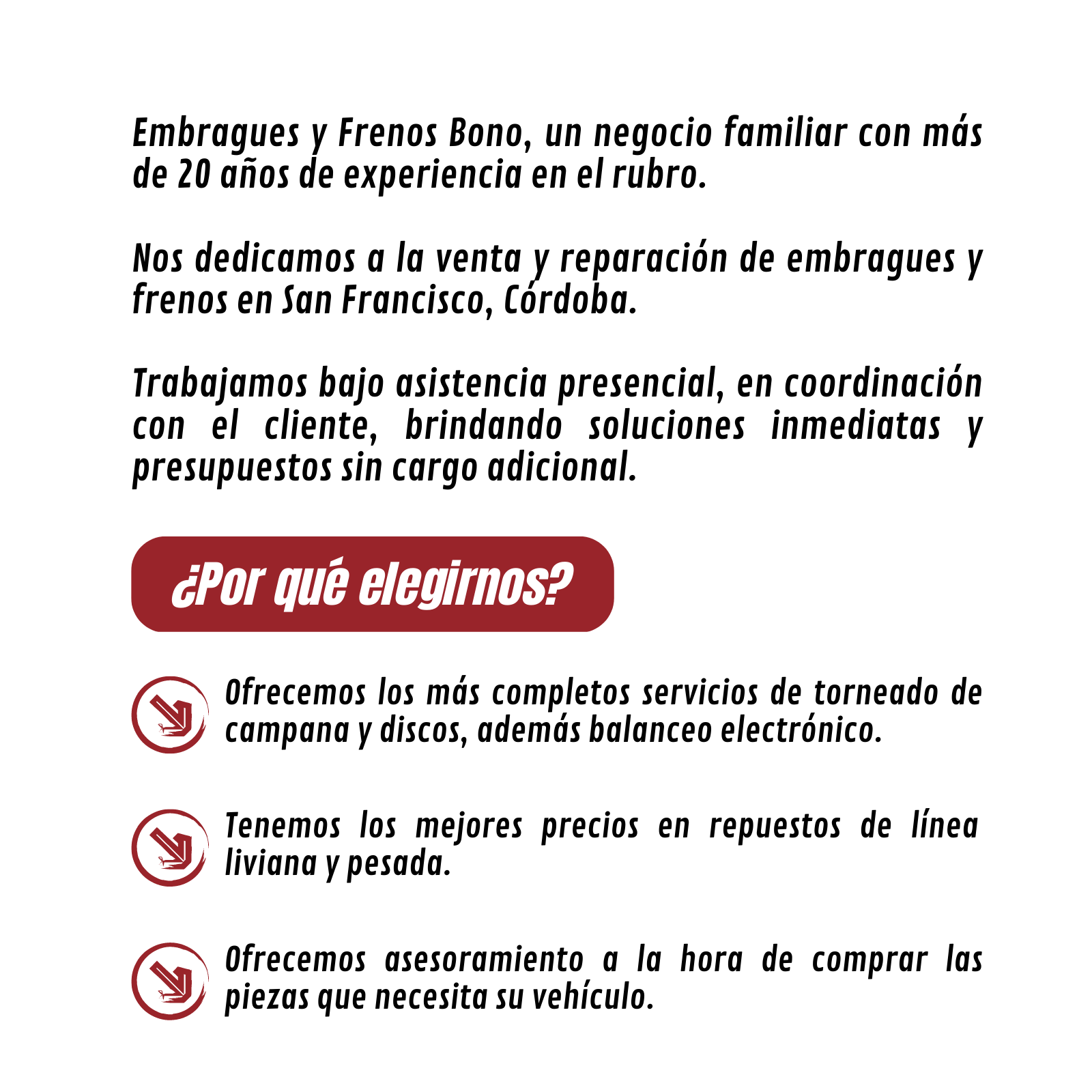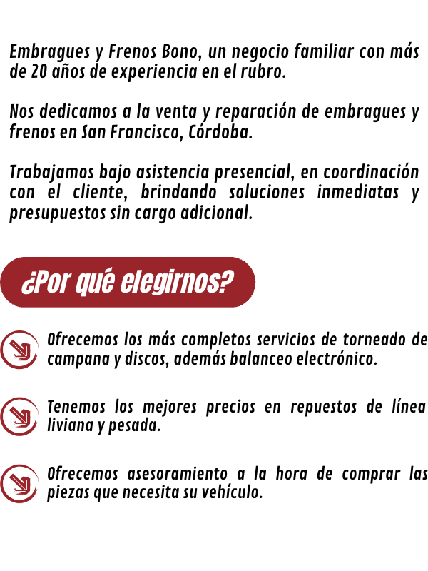 Teléfono (03564) 42 1616 Dirección Rosario de Santa Fé 1872. San Francisco, Córdoba. Email bono_embragues@hotmail.com SeguirSeguir Correo electrónico Registrarse Teléfono (03564) 42 1616 Dirección Rosario de Santa Fé 1872. San Francisco, Córdoba. Email bono_embragues@hotmail.com Correo electrónico Registrarse